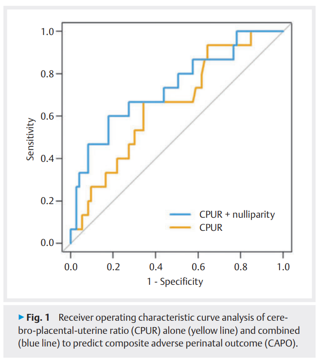 共纳入n=88例病例。初产(p=0.032)和脑-胎盘-子宫比率(CPUR)(p=0.052)是复合不良围产期结局的独立预测因素。然而,脑-胎盘-子宫比率的显著性处于临界值。所有其他多普勒指数均不是复合不良围产期结局的独立预测因素。单独使用脑-胎盘-子宫比率(AUC=0.65,95% CI 0.51至0.80)来区分发生和未发生复合不良围产期结局的妊娠期糖尿病孕妇的能力较差。