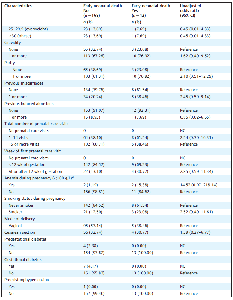 早产(< 37周;uOR 6.9695%置信区间:1.86–29.01)和分娩时产妇年龄增加(≥35年;uOR 5.3395%置信区间:1.21–21.87)与早期新生儿死亡率呈正相关。孕期贫血是另一个特征,与同期存活的脊柱裂婴儿的母亲相比,在新生儿早期死亡的脊柱裂婴儿母亲的比例更高(15.4%对1.2%),具有略微显著的正相关性(uOR 14.5295%置信区间:0.97–218.14),见下表。