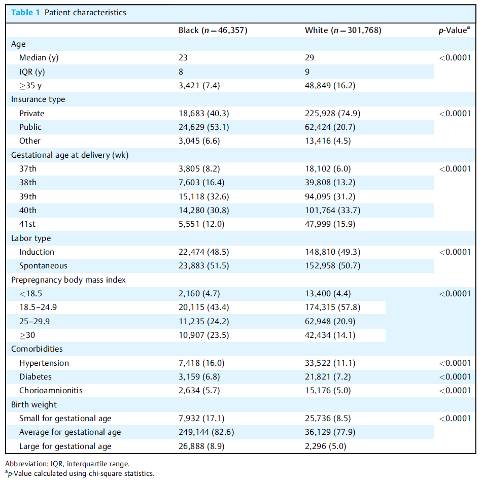 结果:黑人59441例(剖宫产率30.2%),白人363624例(剖宫产率26.1%)。黑人生育人在本研究中是不太可能35岁以上分娩(7.4和16.2%,p < 0.0001),更可能有公共保险(53.1和20.7%,p < 0.0001),和更有可能有高血压(16.0和11.1%,p < 0.0001)和糖尿病(6.8和7.2%,p < 0.0001),见下表。