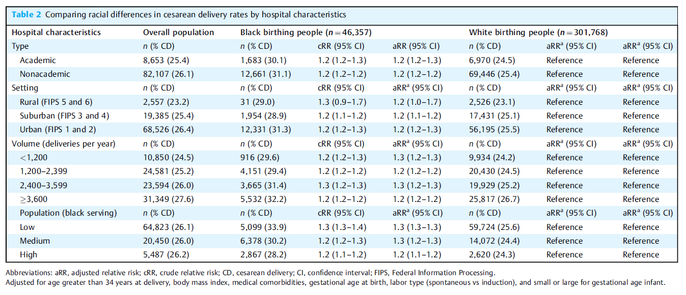 结论:在剖宫产率上的差异持续存在于我们考虑的所有医院层面因素中:学术地位、农村、产生量和患者人口。无论医院的特点如何,差异都大致相同。这些全球风险的增加可能反映了医疗领域的结构性不平等,这导致了妊娠相关发病率和死亡率的差异。