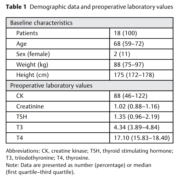我们的分析共有18 名患者(年龄68 [59-72],11%为女性)。根据纳入标准,无患者患有慢性肾损伤或甲状腺功能亢进。患者的人口统计数据和基线实验室值总结在表1中。